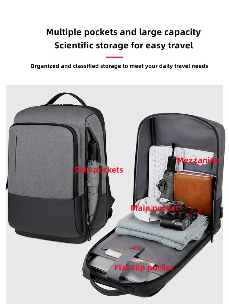 Structure This laptop backpack has one main pocket, one independent computer compartment, one writing group pocket, two front zipper pockets, and two side pockets.