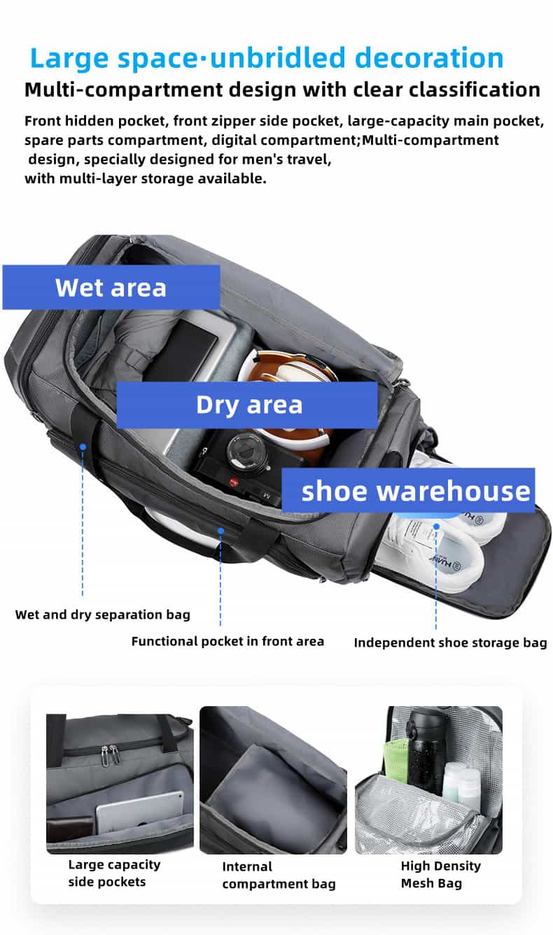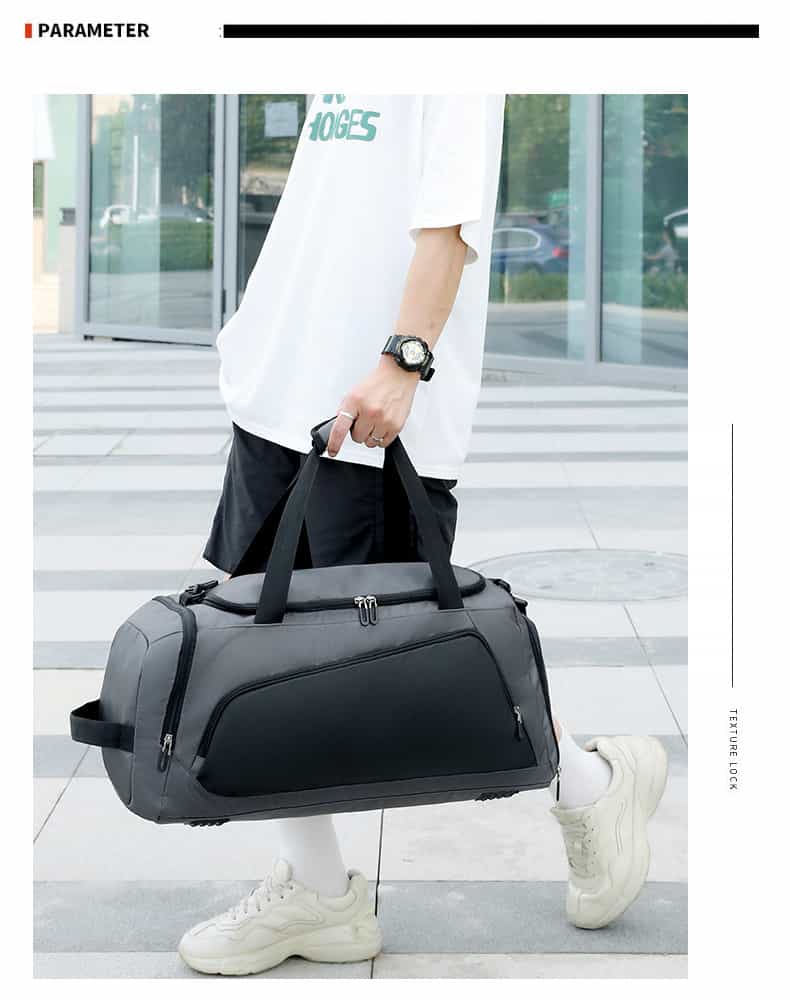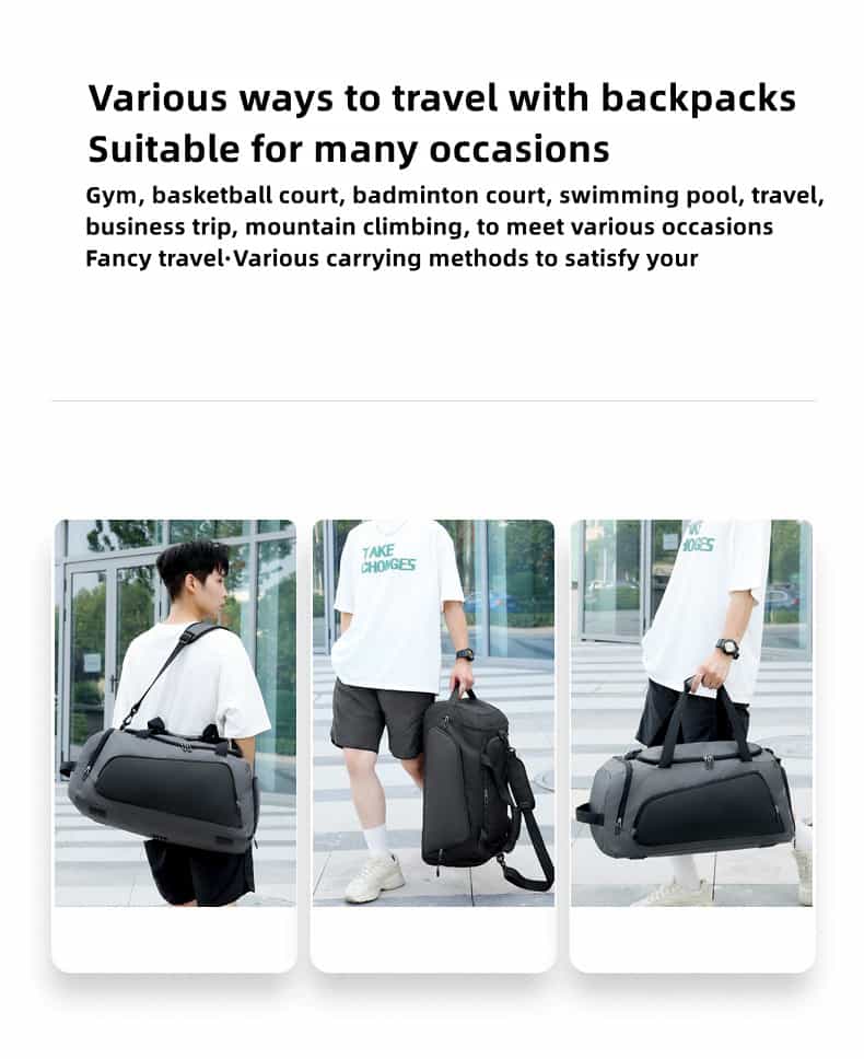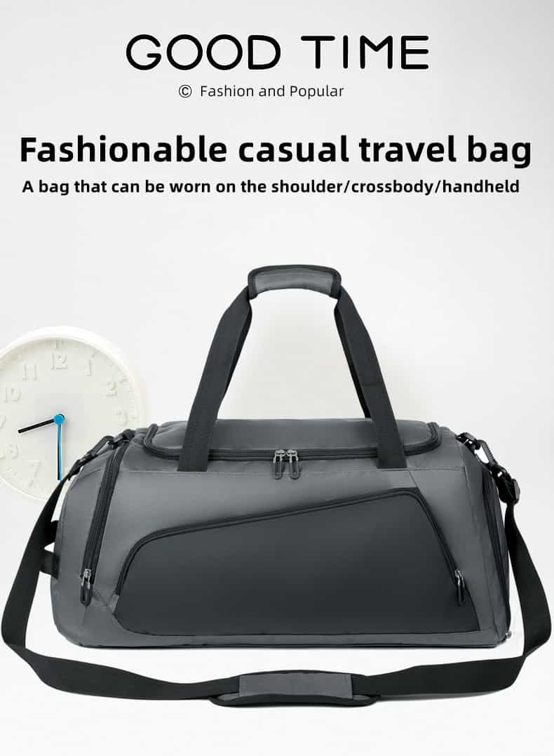This duffel bag is made of water-repellent oxford cloth, and the outer fabric of the backpack is made of a new generation of oxford water-repellent fabric; you can travel with peace of mind even on rainy days. Its clever design is equipped with a wet and dry separation bag and an independent shoe compartment to keep your Things are kept neat and organized. What’s more worth mentioning is that this bag supports a variety of carrying methods such as shoulder, cross-body and hand carry, easily adapting to the needs of different occasions.