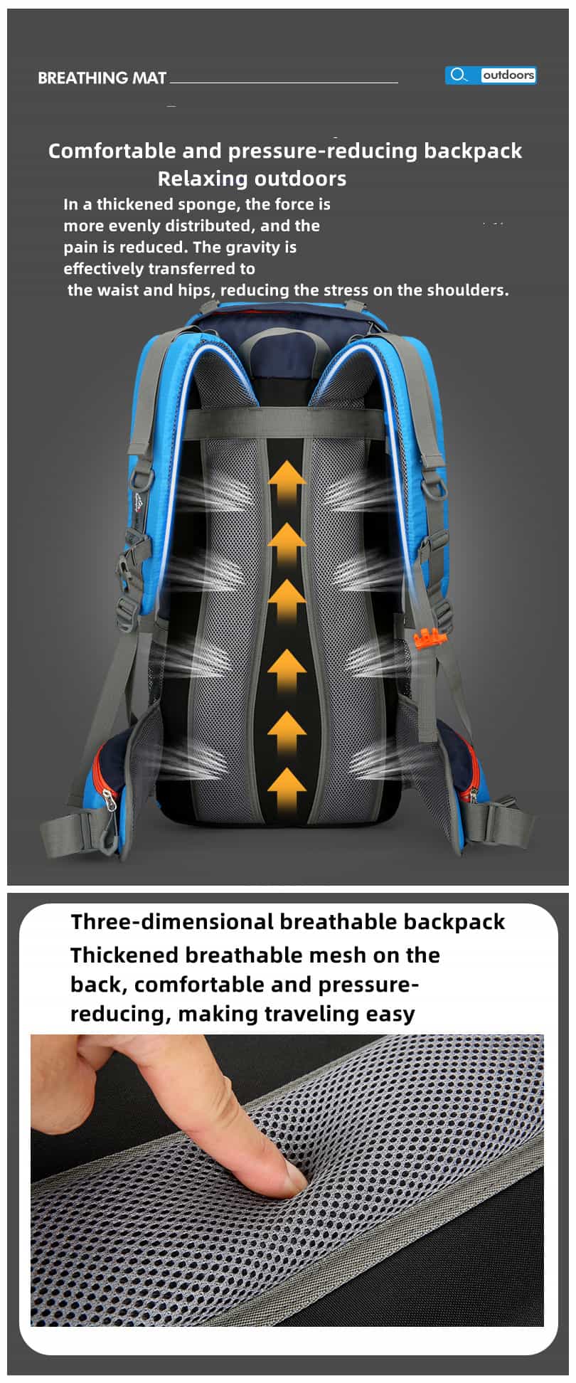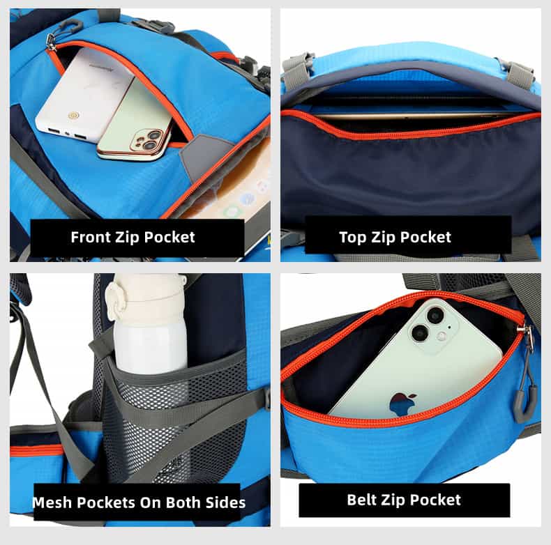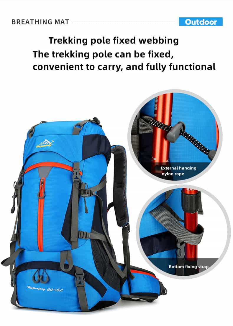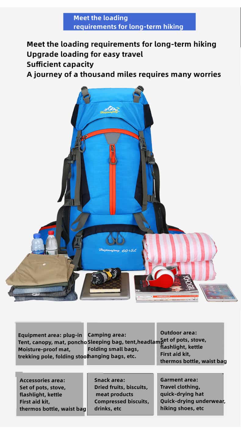 The hiking backpack is made of high-quality, waterproof, and tear-resistant nylon material and is supplied with durable, wear-resistant metal zippers. Breathable, sweat-wicking mesh shoulder straps with foam padding help relieve shoulder pressure.